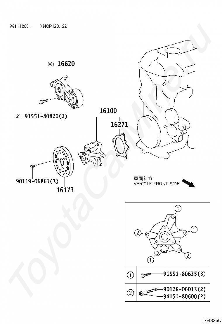 Водяная помпа TOYOTA RACTIS, 2014/05 - 2016/07, 1,5 литра, 16 клапанов DOHC, EFI, GRAMS, NCP120, вариатор