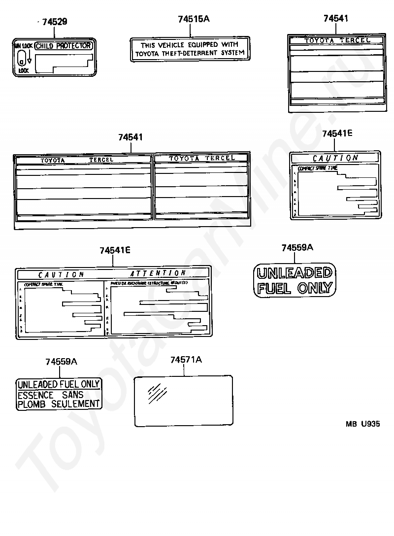 Информационные таблички TOYOTA TERCEL, 1990/09 - 1994/09, 1,5 литра, 12 клапанов, EFI, STANDARD TYPE, EL42, механика, МКПП, 4 ступени