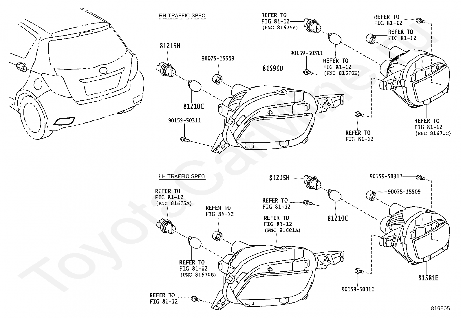 REAR FOG LAMP TOYOTA YARIS/HYBRID(FRP), 2014/07 - 2025, 1 литр, 12 клапанов DOHC, EFI, KSP130, механика, МКПП, 5 скоростей