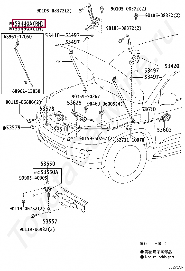 53440-69095, SUPPORT ASSY, HOOD, RH